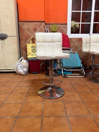 3 sedie alte / sgabelli da cucina in buono stato - Sigüeiro. In vendita 3 sgabelli da cucina, ideali per la barra della cucina o l'isola. Struttura in metallo bianco, molto resistenti e stabili. Sedile imbottito color beige, comode e funzionali. Usate, con normale usura, ma in buone condizioni generali e completamente utilizzabili. Perfette per appartamento in affitto, casa abituale o seconda residenza. Preferibile vendita del set completo. (Prezzo singolo 30€ unità). Ubicazione: Sigüeiro (A Coruña). Ritiro a carico dell'acquirente. Visione senza impegno.