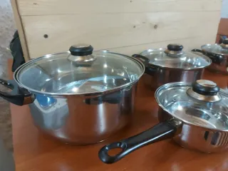 Set di sei pentole in acciaio inossidabile, perfette per equipaggiare la tua cucina. 5 Pentole AMC originali - Acciaio inossidabile di alta qualità - Modello classico con marchio AMC - Molto durevoli - Perfette per una cucina sana Sono pentole per tutta la vita, vendute perché non le usiamo più. Siamo passati alla cucina a induzione e non sono adatte per l'induzione. C'è anche 1 pentola ALZA originale, in acciaio inossidabile. Include il coperchio originale con pomolo ergonomico e manici resistenti. Solo spedizioni in Spagna. Non effettuo spedizioni internazionali a causa del peso.