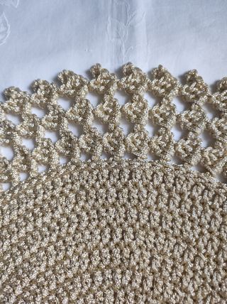Set composto da tre tovagliette sottopiatto fatte a mano ad uncinetto in cordino lamé panna/oro. Nuove, mai usate. Misura in foto.