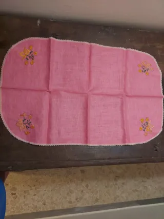 Set di tovagliette 1 ovale e 6 rotonde, perfette per aggiungere un tocco di eleganza alla tua tavola. Diametro delle piccole cm.20, la lunga cm.64 di larghezza e cm. 38 di altezza. - Tovaglietta ovale principale. - 6 tovagliette rotonde più piccole. - Ricami floreali fatti a mano, si vede ancora il disegno fatto per il ricamo non essendo mai state usate né lavate