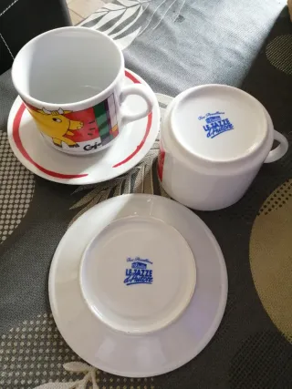 Set di tazze da latte vintage Le Tazze d'Autore di Osella, risalenti agli anni '80/'90. Un tocco di stile retrò per la tua tavola. - Design unico con illustrazioni colorate. - Realizzate in porcellana di alta qualità. - Nuove mai usate, confezione originale.