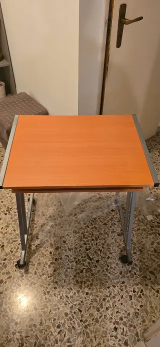 Scrivania compatta con piano in legno e struttura in metallo. - Piano color legno. - Gambe in metallo argentato. Altezza 73 cm Larghezza 54 Profondità 48 cm Aperto 64 cm