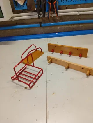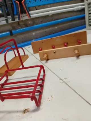 Set di accessori per la cucina con elementi in legno e metallo. - Un elemento con finitura in legno e ganci rossi. - Un altro elemento con finitura in legno e ganci in legno. - Un accessorio a forma di cestino con manici rossi. Vendo per sgombero negozio mobili