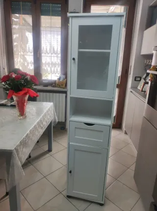 Mobile versatile, perfetto per organizzare al meglio i tuoi spazi in bagno o in cucina. La sua struttura offre diverse soluzioni di contenimento. - Ante in vetro e legno. - Un cassetto superiore. - Una base con anta. - Finitura bianca e grigia.
