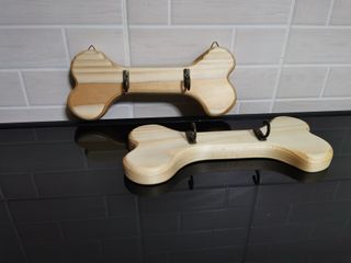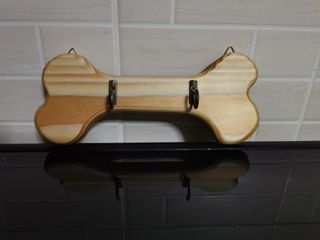 Supporto in legno a forma di osso, realizzato a mano, ideale per appendere guinzagli, collari o pettorine e porta sacchetti o altri accessori per cani e gatti. - Realizzato in legno. - Design a forma di osso. - Dotato di ganci metallici (forma e colore variabile a seconda della disponibilità) - dotato di gancetti per poter essere fissato ad una parete