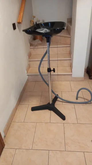 Lavabo portatile per shampoo con tubo di scarico integrato. Facile da usare e da spostare. - Struttura in metallo resistente. - Vasca in plastica nera. - Tubo flessibile in gomma per lo scarico.