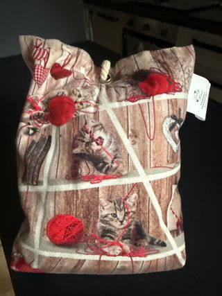 Ferma porta in tessuto con un simpatico disegno di gattini che giocano con gomitoli di lana rossi. - Design a tema gattini e gomitoli. - Dettagli con cuoricini rossi. - Cordino per appenderlo.