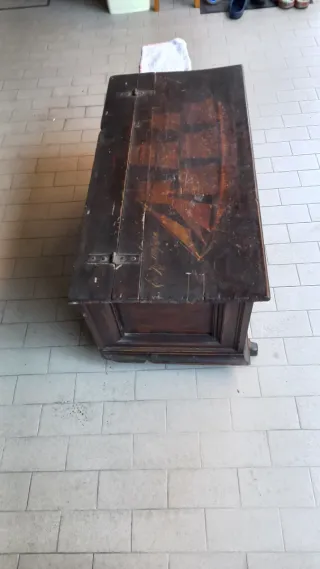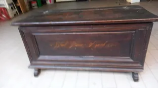 Bellissima cassapanca in legno risalente agli anni '50, con un design classico e robusto. - Realizzata in legno scuro. - Presenta decorazioni dipinte sul coperchio. - Cerniere metalliche visibili.dimensioni 100x50x50