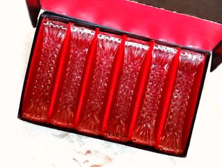 Raro set regalo vintage firmato Mikasa (USA), fine anni ’70, realizzato in cristallo della linea Mikasa CRISTAL. Il set comprende: un bellissimo tappo in vetro cristallo con parte superiore modellata come un grappolo d’uva e sottobottiglia - elemento rotondo con motivo radiale “sunburst”, bordi sfaccettati e vetro spesso. Scatola rigida in velluto bordeaux, oroginale e perfettamente conservata, all’interno è presente l’immagine originale del set. Il brand Mikasa (fondata nel 1948 negli USA) è uno dei marchi americani più prestigiosi nel settore della tavola: cristallo, vetro artistico, porcellana e giftware di alta qualità.