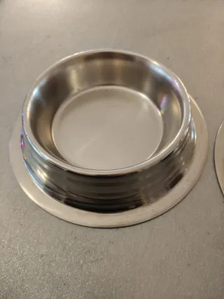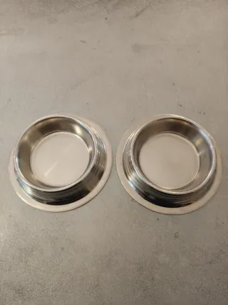 Set composto da due ciotole in acciaio inossidabile, perfette per cani piccoli o gatti. Dimensione bocca 14 cm diametro altezza 4 cm - Materiale: acciaio inossidabile - Colore: argento - Quantità: 2 pezzi
