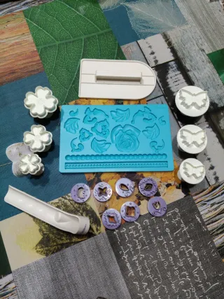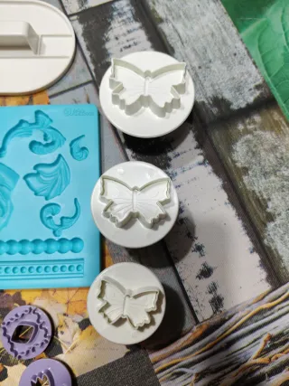Set di attrezzi per decorare pasta di zucchero, ideale per creare bellissimi dettagli floreali e farfalle. - Stampini a forma di fiore. - Stampini a forma di farfalla. - Matrice in silicone con disegni floreali e bordo ondulato. - Lisciatore per pasta. - Formine rotonde con decorazioni. Poco usate.