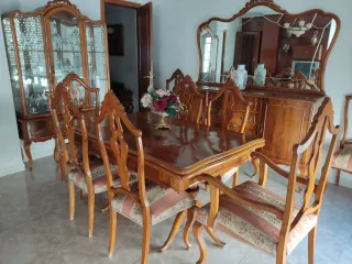 Tavolo da pranzo elegante in stile classico. Sebbene in buone condizioni, necessita di restauro puntuale. Realizzato in legno con finitura marrone scuro. Design con gambe curve e dettagli ornamentali. Fa parte di un set di mobili da pranzo classici (divani, sedie, vetrina, credenza) che possono essere venduti come gruppo.