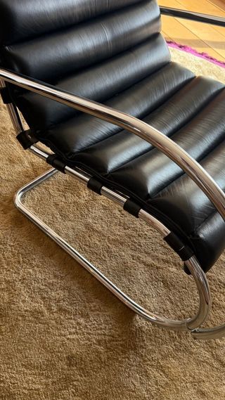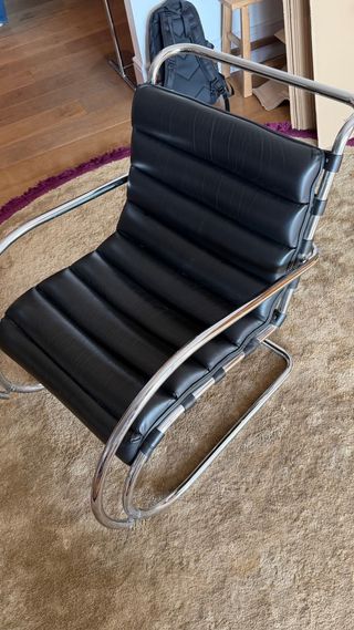 Poltrona MR, design di Ludwig Mies van der Rohe, uno dei grandi simboli del movimento moderno e della Bauhaus. Struttura in tubo di acciaio cromato con sedile e schienale in pelle nera imbottita. La poltrona presenta una patina naturale dovuta all'uso del tempo, con pieghe e segni visibili nelle foto. Il cromo è in ottime condizioni, solido e luminoso. Strutturalmente solida e comoda. Design senza tempo, adatto sia per interni contemporanei che per spazi più classici. Ideale per soggiorno, ufficio, studio o come pezzo da collezione di design del XX secolo. Non è un mobile di produzione di massa attuale.