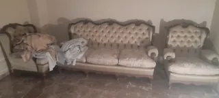 Divano e poltrone classici in stile Luigi XV Mobili, legno e tappezzeria di alta qualità in perfette condizioni, ad eccezione del divano con lievi danni mostrato nella foto. Possono essere venduti anche separatamente. Le offerte vengono ascoltate. RITIRO A GETAFE Larghezza 183 profondità 80 altezza 102 cm (con modanatura)
