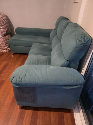 Divano chaise longue in tessuto di un bel colore verde acqua. Angolo molto comodo e spazioso. Design moderno e funzionale. Gambe in metallo. La misura del chaise longue è di 140 cm.
