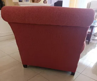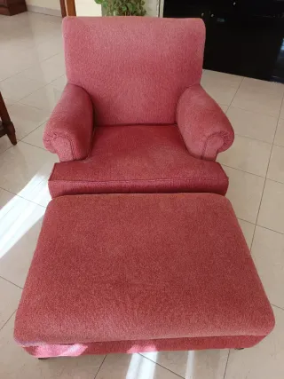 Comoda poltrona con poggiapiedi abbinato, ideale per rilassarsi. Rivestimento in tessuto tipo chenilla. Rivestito un anno fa. Colore rosso granato. Imbottitura del cuscino in piume. Gambe in legno con ruote in metallo dorato vecchio stile. Si vende per trasloco. Nessuna spedizione. Ritiro a casa.