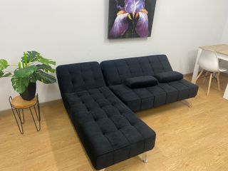 Divano chaise longue dal design moderno ed elegante. I cuscini aggiungono un tocco di colore e comfort. Quasi nuovo, con meno di un anno di utilizzo. La posizione può essere cambiata come mostrato in foto. Possibilità di trattare per ulteriori informazioni e foto.
