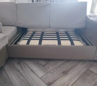 Divano con penisola, perfetto per rilassarsi o per ospitare. Con cassettone molto capiente per riporre cuscini e coperte, alzando la parte estraibile può diventare un letto matrimoniale. Acquistato a marzo 2024 vendo per cambio arredo. - Rivestimento in tessuto. - Colore beige/grigio.