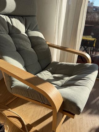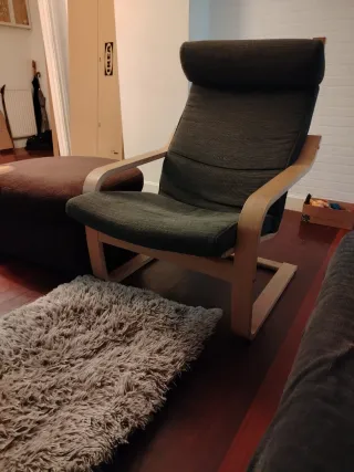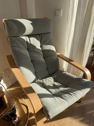 Comoda poltrona Poäng di Ikea, ideale per rilassarsi. Il suo design senza tempo si adatta a qualsiasi spazio. - Struttura in legno curvato. - Cuscini imbottiti per un maggiore comfort. - Poggiatesta regolabile.