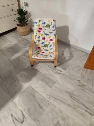 Poltroncina per bambini in legno del marchio Ikea. Il cuscino ha un divertente motivo di dinosauri.