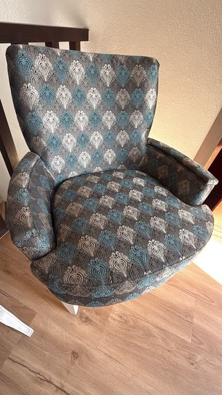 Vendo poltrona singola imbottita, molto comoda e con un design elegante in stile vintage/retrò. Ideale per sala d'attesa, angolo lettura, camera da letto o zona relax. ✔️ Sedile ampio e confortevole ✔️ Schienale alto ✔️ Braccioli imbottiti ✔️ Gambe bianche in legno ✔️ Rivestimento originale con motivo geometrico in toni di verde e blu ✔️ Struttura solida, buone condizioni generali Misure approssimative: 📏 Altezza: 85–90 cm 📏 Larghezza: 70 cm 📏 Profondità: circa 70 cm Perfetta se cerchi un pezzo con personalità che non sia la tipica poltrona noiosa da catalogo.