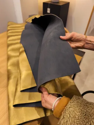 3mt x 1mt x 2 millimetri circa. Tessuto per tappezzeria con un design accattivante ed elegante. Ideale per tappezzeria, testata del letto o per dare distinzione a dettagli su mobili o pareti. - Finitura brillante in tonalità dorate. - Retro in colore scuro.