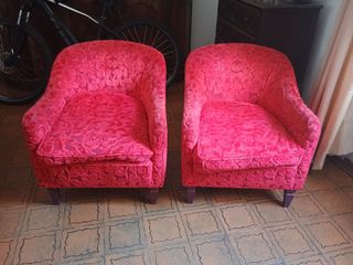 Bellissimo divano e due poltrone in velluto rosso, perfette per arredare con stile il tuo salotto. - Il divano è a due posti. - Le poltrone sono due. - Sono in ottime condizioni.