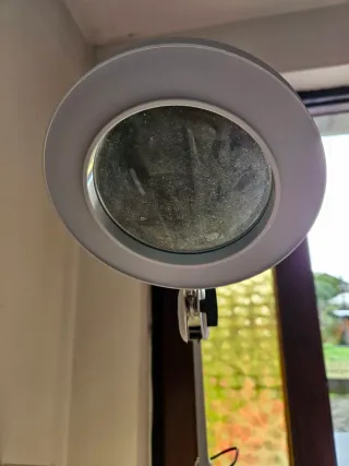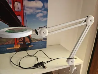 Lampada da tavolo con lente d'ingrandimento e braccio flessibile. - Braccio regolabile in altezza e inclinazione. - Lente in vetro per un ingrandimento chiaro. - Base stabile con morsetto per fissaggio. - alimentata con porta usb