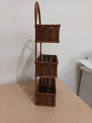 Elegante portaoggetti a tre ripiani, realizzato in ferro rivestito in vimini. - Struttura a tre cestelli sovrapposti. - Finitura in vimini intrecciato color marrone. - Manico superiore per un facile trasporto o aggancio. ⚠️spedisco in Italia con Poste Italiane e in Spagna con BRT⚠️ ⛔️NO SPEDIZIONI InPost⛔️