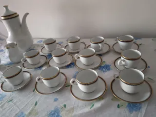 Elegante servizio da caffè in porcellana per 12 persone, con finiture dorate. Servizio Da Caffè Da 12 Persone Porcellana Kamla German Democratic Republic Vin. C'è una tazzina che se leggermente cancellato il marchio come da foto mostrato - Include caffettiera, zuccheriera e lattiera. - 12 tazzine con piattini. - Design classico con dettagli oro.