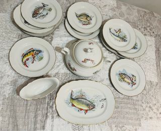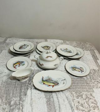 Elegante servizio di piatti in porcellana Tognana, decorato con raffigurazioni di pesci. - Design con pesci colorati. - Bordo dorato. - Include zuppiera e salsiera