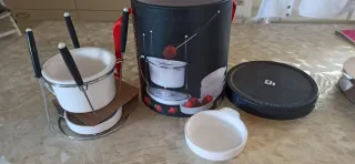 Set per fonduta di cioccolato, ideale per dolci momenti. - Ciotola principale in ceramica. - Supporto in metallo. - Forchette con manici in plastica. Mai usato, ricevuto come regalo e tenuto molto tempo in un armadio. Per questo le parti in metallo in alcuni punti hanno delle leggere macchioline.