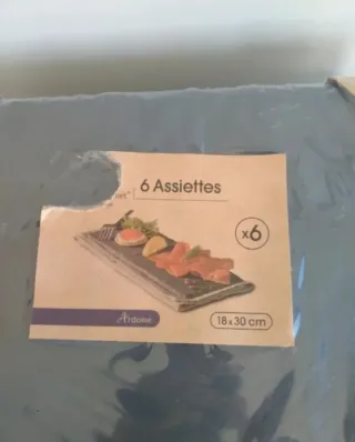 Set di sei piatti in ardesia, perfetti per servire antipasti o stuzzichini.nuovi - Materiale: ardesia naturale. - Colore: nero/grigio. - Dimensioni: 30 x 15 cm.