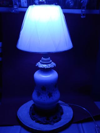 Lampada da tavolo in stile vintage, con una base decorata e un paralume elegante. - Base in metallo lavorato. - Corpo della lampada in ceramica con decorazioni floreali. - Paralume in tessuto.
