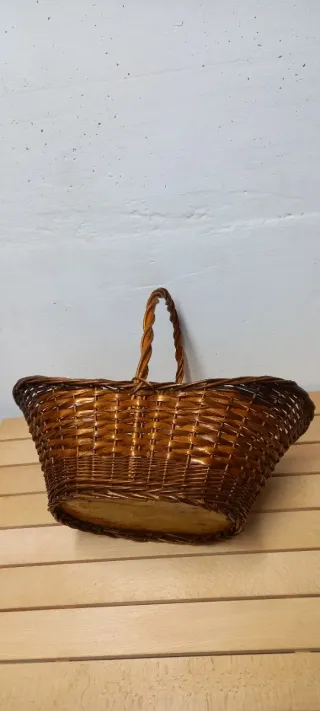 Cesta in vimini con un pratico manico per il trasporto. RTIGIANALE - Realizzata in vimini intrecciato con base in legno. - Colore marrone caldo.
