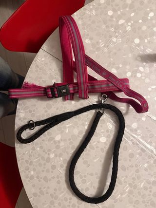 Pettorina per cani di taglia XL, con guinzaglio abbinato. - Pettorina imbottita per un maggiore comfort. - Guinzaglio intrecciato resistente. - Dettagli riflettenti per una maggiore visibilità. Era di una Labrador di 40 kg, misura grande, si infila dalla testa e si aggancia sotto al busto, regolabile. Utilizzata per molto tempo ma non presenta particolari difetti se non estetici. Compreso guinzaglio di grande spessore. Colore rosa scuro, guinzaglio nero.