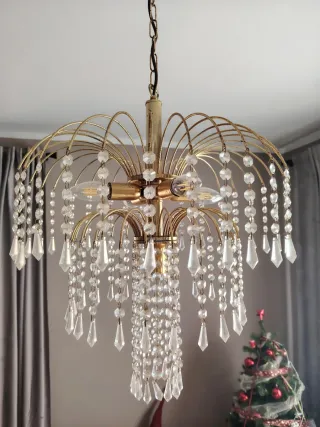 Elegante lampadario in stile vintage, con una cascata di cristalli che ricorda la pioggia. Vendo anche a coppia 250€ - Struttura in metallo dorato. - Pendenti in cristallo trasparente. - Design a cascata.