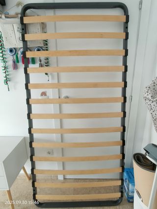 Base somier con struttura metallica e stecche in legno. Design moderno e funzionale. Combina la resistenza del metallo con la flessibilità del legno. Non ha le gambe.