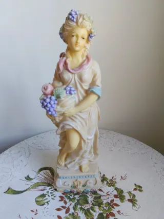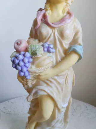 🌷Statua decorativa raffigurante una donna con un cesto di frutta. 🌷Dettagli floreali sui capelli e sul vestito. 🌷 Colori pastello tenui che la rendono ideale come completamento d'arredo per salotti, vetrine, o ambienti raffinati. 🌷 Perfetta anche per giardino