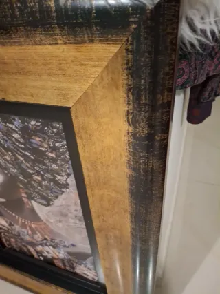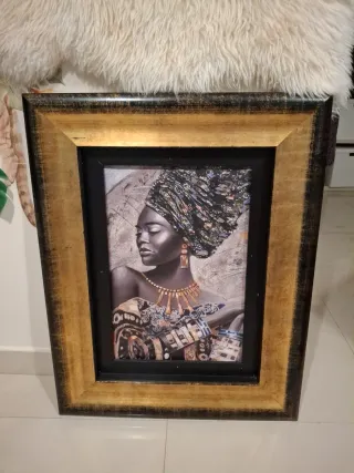 Splendido quadro decorativo con l'immagine di una donna africana. La cornice conferisce un tocco elegante. Misura 63x81. Design con dettagli in dorato e multicolore. Cornice in legno.