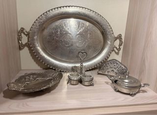 Elegante set in peltro, marca Mam. - Vasso decorato - Alzata - Portatovaglioli - Coppia di saliere - Zuccheriera