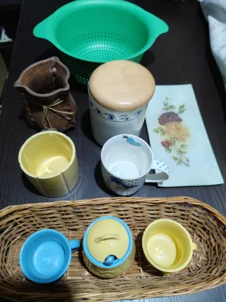 Set di 10 pezzi per la cucina, ideale per diverse preparazioni. - Scolapasta verde in plastica Ikea - Vaso in ceramica con coperchio in legno. - Tazza in ceramica con decoro floreale. - Tazza gialla in ceramica. - Tazza blu in ceramica. - Zuccheriera gialla con coperchio. - Tazza gialla in ceramica. - Vaso decorativo in materiale simile al legno. - Ciotola in vimini.