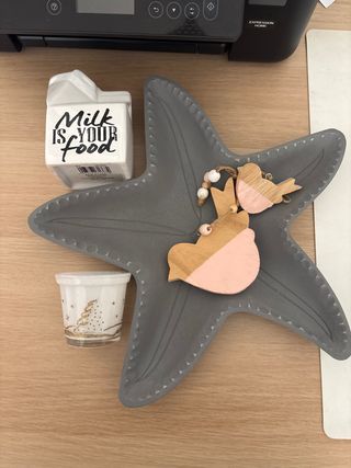 Set di oggetti decorativi che include un vasetto e un portaoggetti. - Vasetto in ceramica con decorazioni dorate. - Portaoggetti a forma di stella marina grigia. - Due decorazioni in legno a forma di uccellino con dettagli rosa.