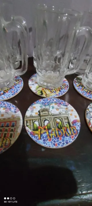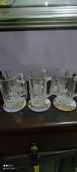 Set composto da 6 bicchieri con manico e relativi sottobicchieri. - Bicchieri trasparenti massiccio vintage con decorazioni. - Sottobicchieri colorati il sotto di sughero