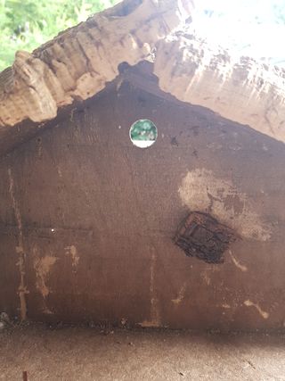 Bacheca in legno a forma di casa. Difetti come in foto. Misure: 23x26 cm, profondità 3,5 cm.