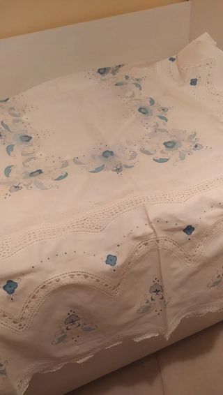 Tovaglia in organza di lino, con applicazioni e ricami. misura 270x180 più 12 tovaglioli. Facendo parte di un antico corredo, presenta macchie di baule visibili in foto che vanno via con un trattamento specifico. Disponibile anche il copriletto matrimoniale coordinato.