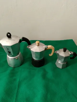 Set di tre caffettiere Bialetti in stile vintage. - Realizzate in metallo e legno. - Diverse dimensioni per preparare caffè per più persone.Una mica grande Bialetti Dama una media Forever Prestige,una piccola mica espressa Bialetti
