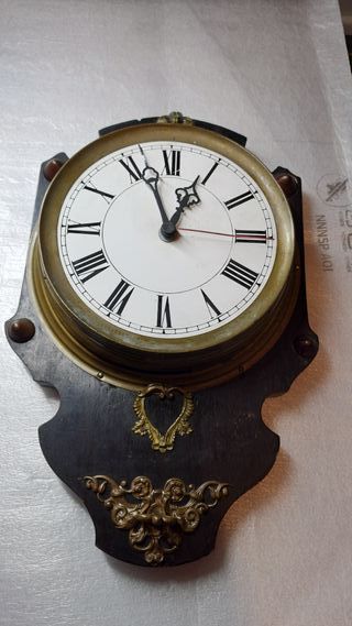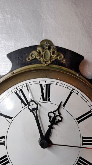 Orologio da parete antico, con meccanismo funzionante. - Struttura in legno con finiture scure. - Dettagli in metallo per il fissaggio.