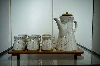 Elegante set da tè Schlëizer composto da teiera e sei tazze, completo di base in bambù. - Teiera con coperchio in legno. - Tazze con manici. - Design con finiture dorate e bianche.