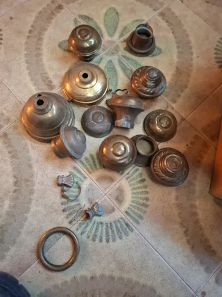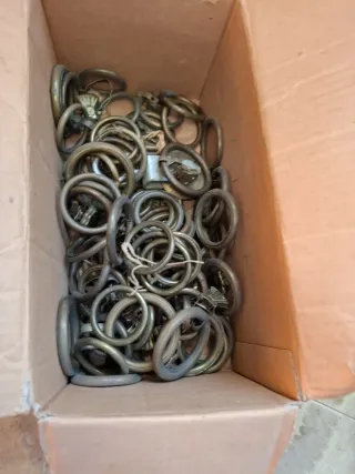 Lotto di accessori in metallo dorato, ideali per illuminazione e decorazione. - Portalampada - Anelli per tende - Ganci assortiti per tende.